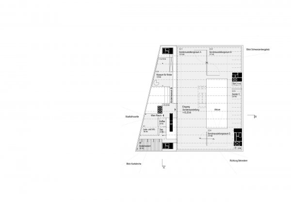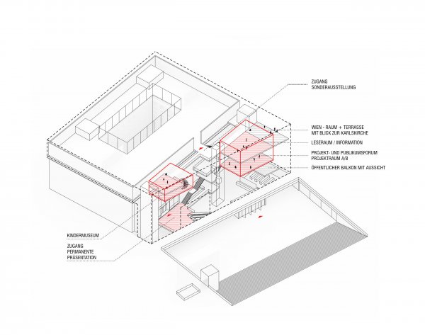 eigenständig funktionierende Räume beinhaltet, die als Kindermuseum, Publikumsforen, der Bildung und für den Wien Raum dienende Flächen genutzt werden können.