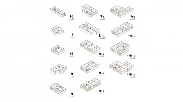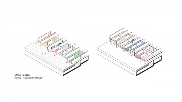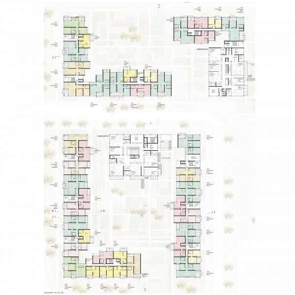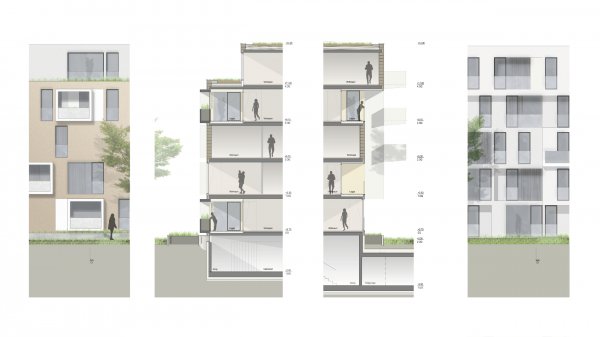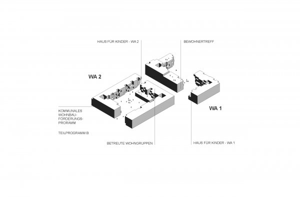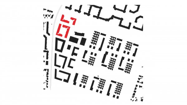 Hofseitig innerhalb des Wohnblocks entsteht jedoch durch den formgebenden Prozess der Gruppierung von Einzelelementen der individuelle und eigenständige Charakter der Bebauung. Die Gebäudegestalt ist dabei, und dies ist von grundlegender Bedeutung, nicht das Ergebnis einer formalen Überformung, sondern das Resultat einer freien Gruppierung der geforderten Wohnungs-Arrangements bzw. daraus entwickelter Grundrisstypologien.