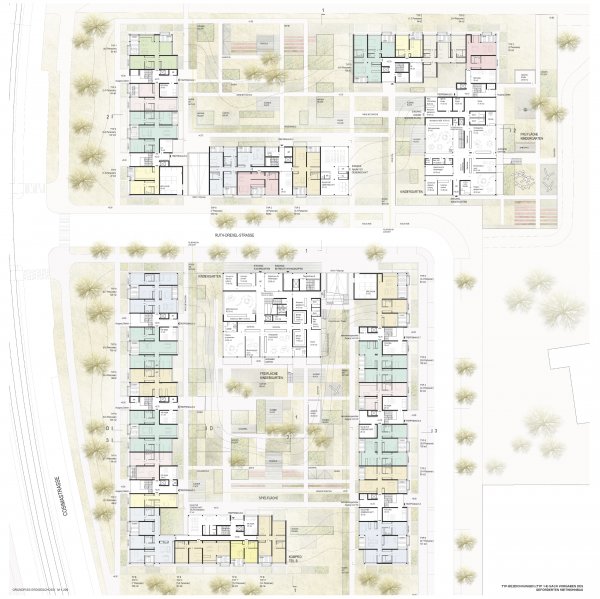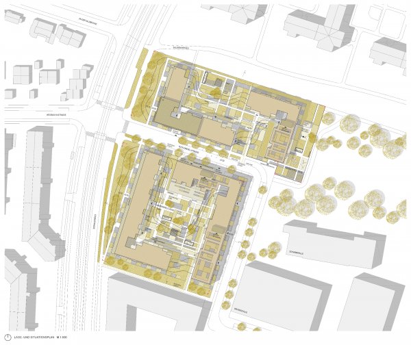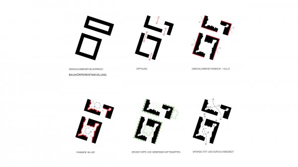 Das Projektkonzept vereint zusammengefasst die städtebauliche Komposition von Baukörpern (Volumen, Hülle) in der Blockrandbebauung mit der Idee eines formgebenden Konzepts als Abbild sozialer Vielfalt und Durchmischung.