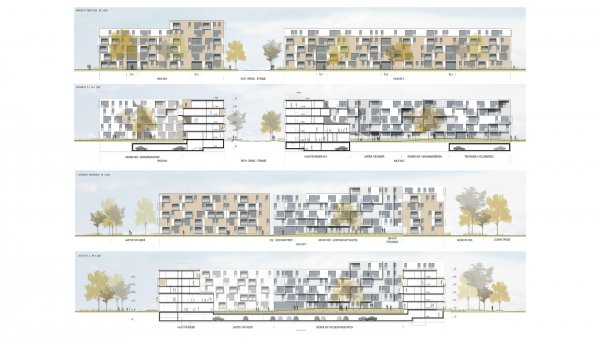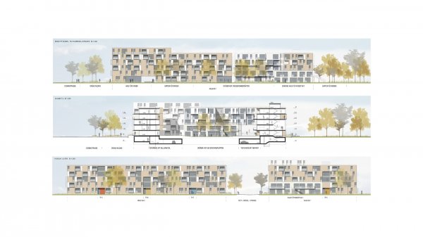 Die Formgebung der Baukörper resultiert aus einer Verschränkung von groß- und kleinmaßstäblichen Überlegungen. Das äußere Erscheinungsbild der aufgelösten Blockrandbebauung erfüllt dabei bezüglich Volumen und Gestalt zur Gänze die Anforderung zur Eingliederung in das neu entstehende Quartier.