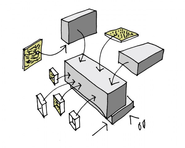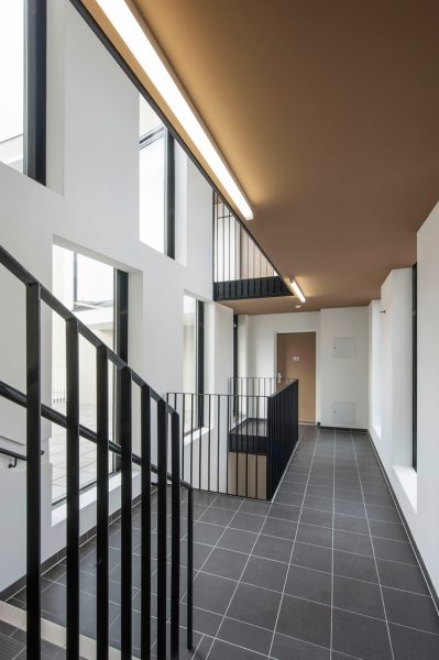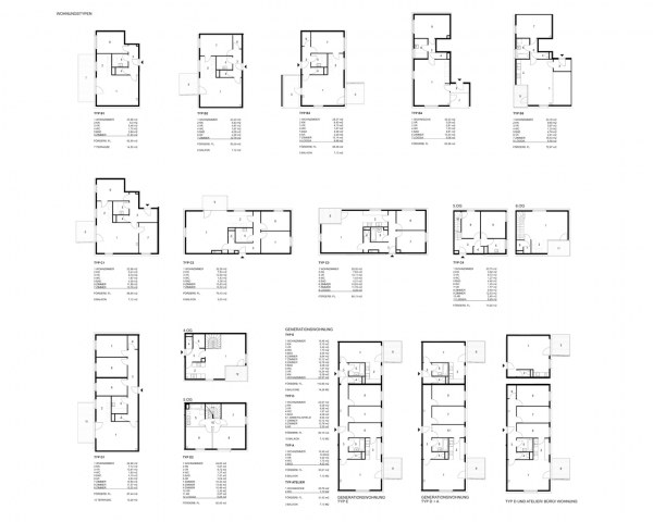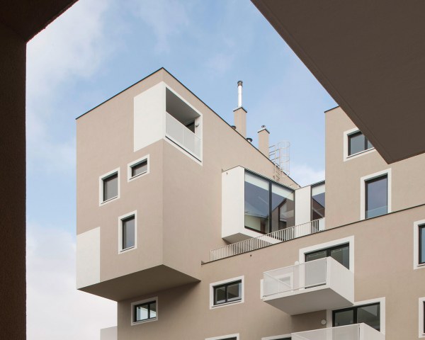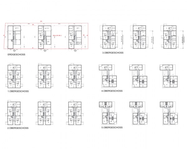 Unterschiedliche Wohnungstypen mit jeweils speziellen, zugeordneten Freiräumen werden zu einer neuen Typologie gestapelt. Allen Wohnungen ist eine individuelle Freifläche zugeordnet.