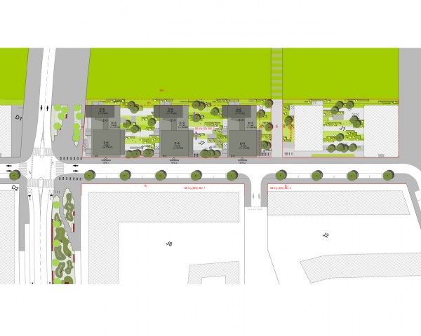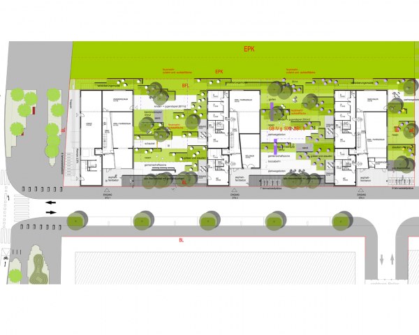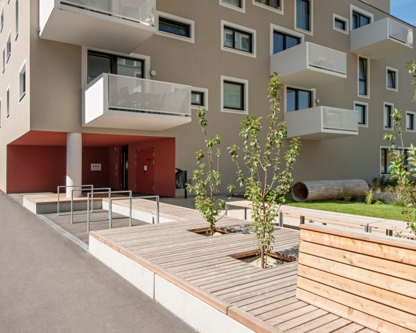 Introvertierte, hofähnliche Situationen und parkartige Szenarien schließen an extrovertierte, straßenbezogene Räume an. Die großen Innenhöfe bieten eine differenzierte Freiraumgestaltung mit öffentlichem Straßenraum, schaffen Sitz- und Trennmöbel gemeinsam mit der Bepflanzung eine Barriere zur Öffentlichkeit.