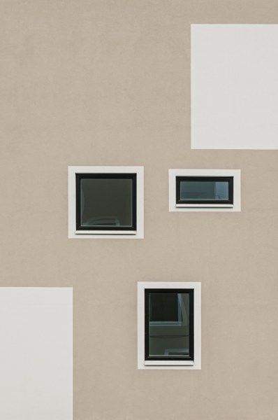 Versetzt angeordnete und rythmisierte Loggienelemente bestimmen die Hauptfassade in der Zone (3), die Balkonelemente rhytmisieren die Regelgeschoße (2). Die höheren Geschoßhöhen im Erdgeschoß ermöglichen auch eine kommerzielle Nutzung. Die ruhige Erdgeschoßzone bildet einen Sockel (1). Die einfachen Lochfassaden weisen jeweils 4 verschieden Fenstergrößen auf, die durch ihren unterschiedlichen Versatz und Proportion als Fläche wirken.