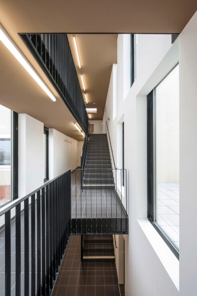Die Dreiteilung der Baukörper stellt in folgenden Bereichen eine Neuinterpretation der charakteristischen Fassade eines Gründerzeithauses dar.
